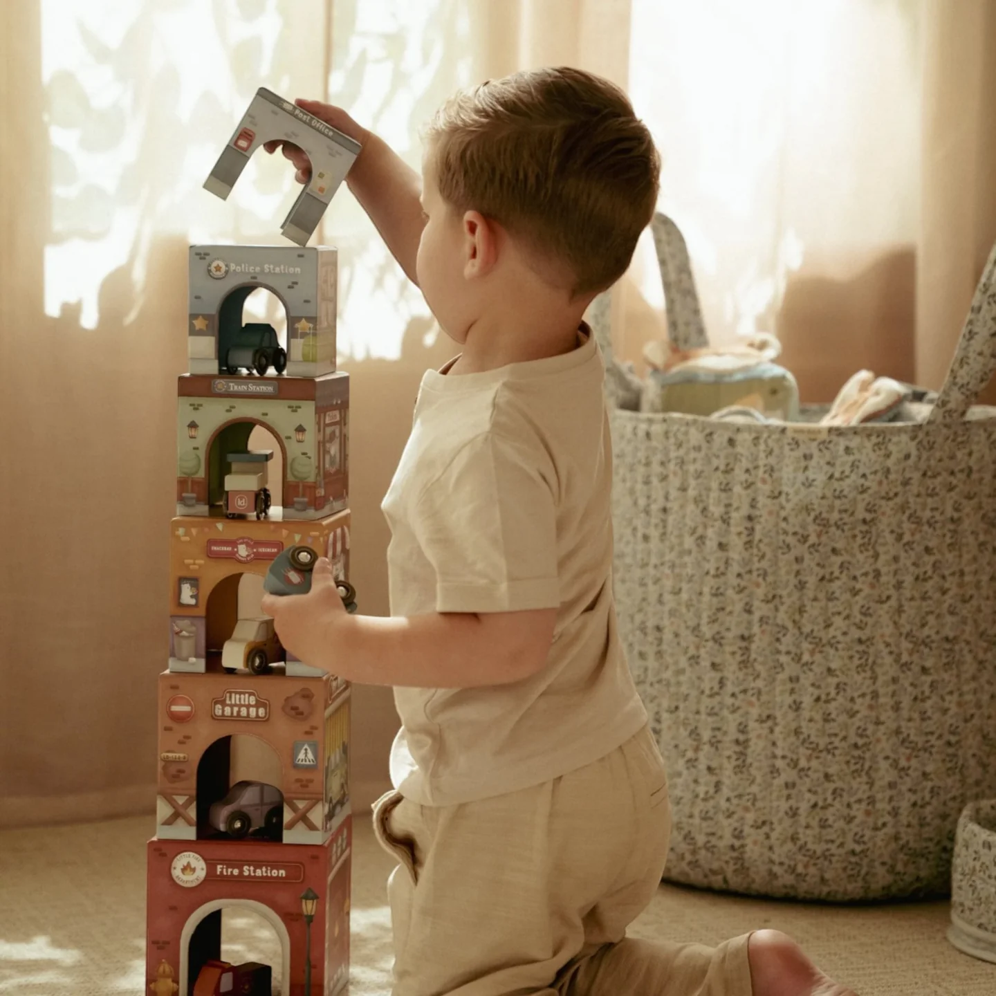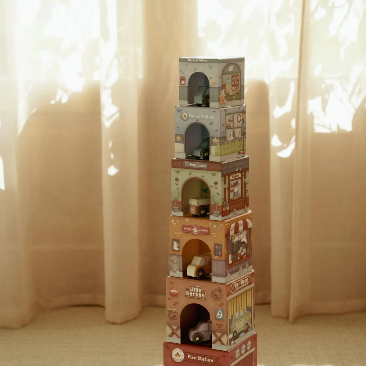 Περιλαμβάνει 6 κύβους από ανθεκτικό χαρτόνι με πιστοποίηση FSC και ξύλινα αυτοκινητάκια.