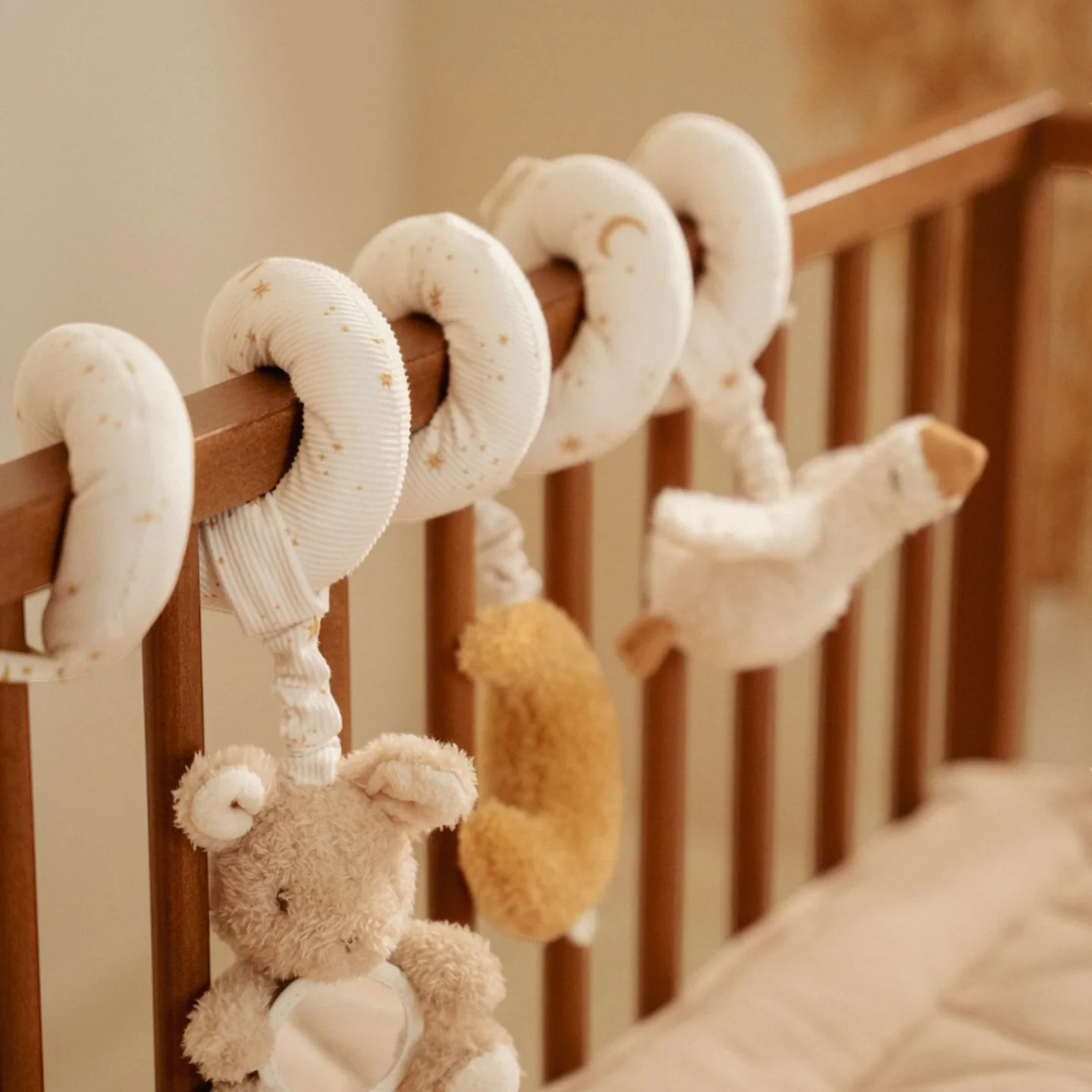 Φτιαγμένο από βαμβάκι, αυτό το σπιράλ διαθέτει μια μικρή χήνα, ένα κουνελάκι και ένα φεγγαράκι.