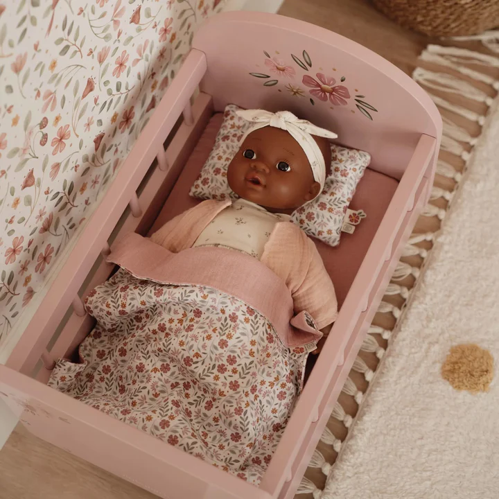 Είναι κατασκευασμένο από ανθεκτικό ξύλο και για να είναι ιδιαίτερα άνετο για τα κουκλάκια σας, συνοδεύεται από μαξιλάρι, κουβερτούλα και στρωματάκι με υπέροχο φλοράλ σχέδιο.