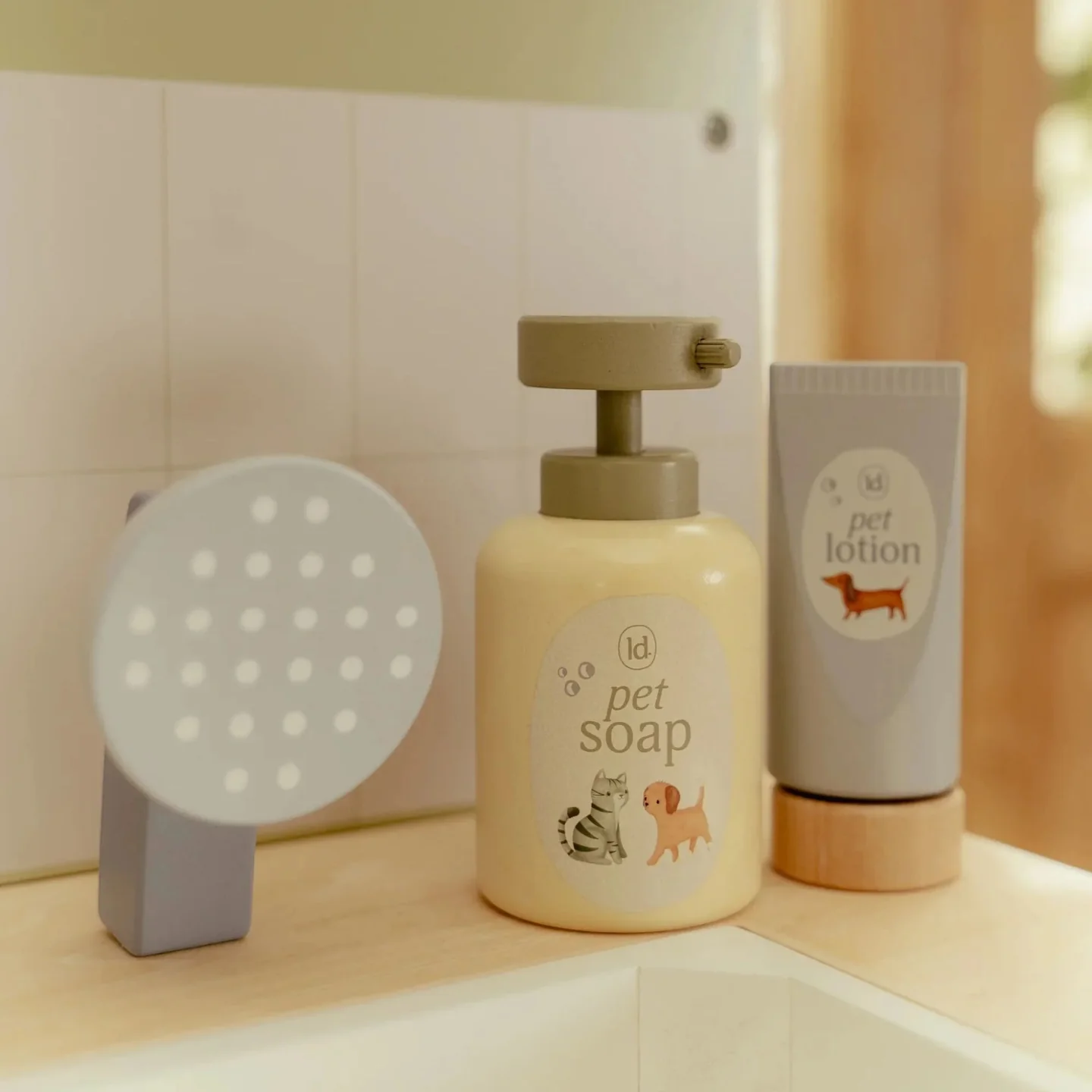 Το σετ περιλαμβάνει όλα όσα χρειάζεται ένας μικρός κτηνίατρος: αναδιπλούμενο ντους με νεροχύτη, χτένα, θερμόμετρο, σύριγγα, επιδέσμους, υφασμάτινη κορδέλα για το κεφάλι και ειδικό κλιπ για ιατρικά διαγράμματα και ακτινογραφίες.