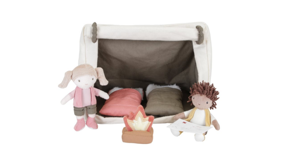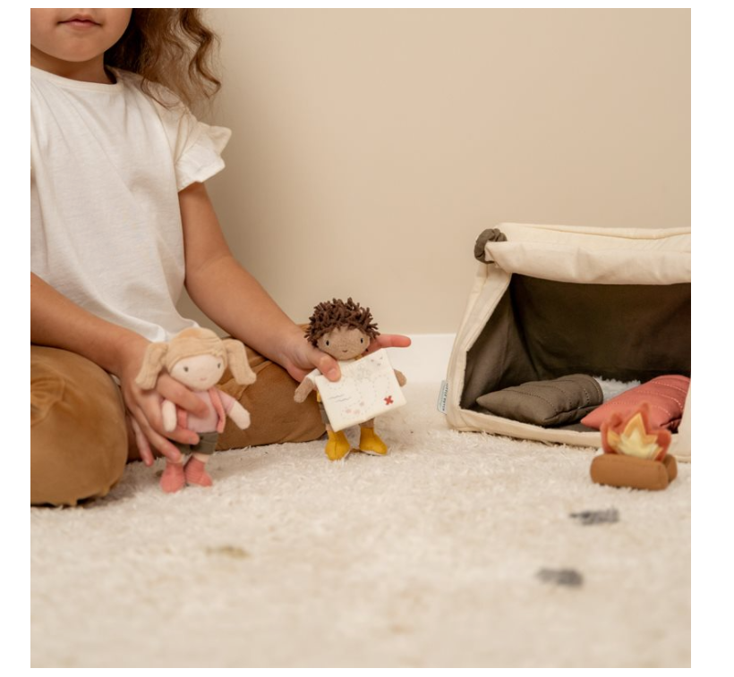 Πάμε για κάμπινγκ! Ο Τζέικ και η Άννα ανυπομονούν να ζήσουν μαζί σας την περιπέτεια. Πού θα κατασκηνώσετε με αυτούς τους δύο εξερευνητές; Ακολουθήστε το χάρτη ή επιλέξτε το δικό σας σημείο για να στήσετε τη σκηνή. Στο σαλόνι ή στο γρασίδι στην ύπαιθρο; Για να είναι άνετα και ζεστά, ο Τζέικ και η Άννα έφεραν τους υπνόσακους τους. Η σκηνή μπορεί να ανοίξει και να κλείσει και χωράει και τις δύο κούκλες στους υπνόσακους τους. Αυτό το σετ camping με κούκλες θα ενθαρρύνει το μικρό σας να φανταστεί τις πιο συναρπαστικές περιπέτειες κατασκήνωσης στο δάσος, στην παραλία ή στο φεγγάρι! Καλή κατασκήνωση!